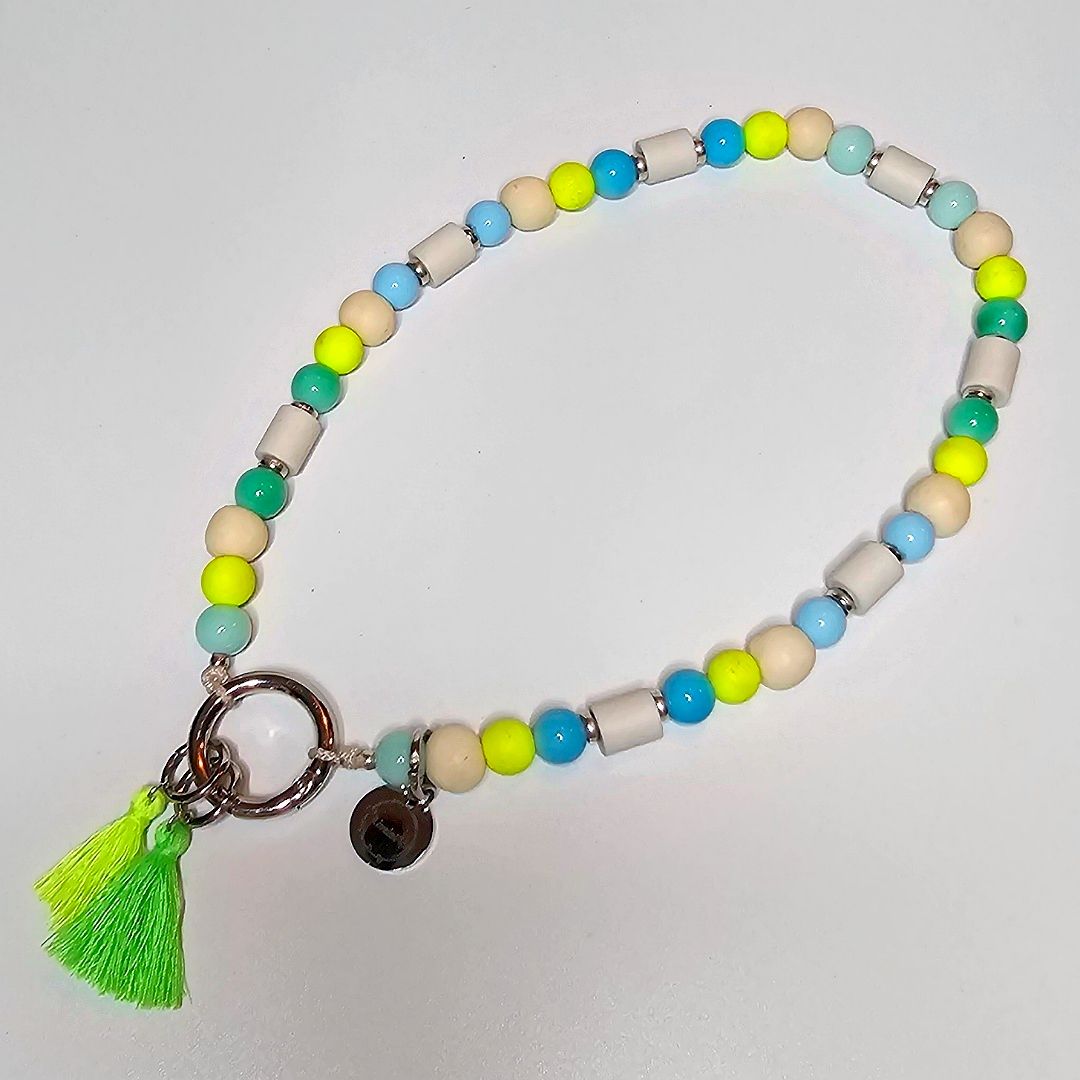 Glow in the dark, super blits overdag, en veiligheid in de avonduren - dat is onze Anti-tekenketting GLOW UP Neon Green! Met opvallende Neon kralen straalt je harige vriend overdag stijlvol, terwijl de LivalaPip handmade Glow in the dark kralen 's avonds zorgen voor een opvallend en veilig gloeiend effect. Laad de ketting eenvoudig op onder een lamp voor een maximale gloed in het donker. Onze ketting biedt niet alleen een modieuze toevoeging aan de outfit van je harige metgezel, maar ook gemoedsrust tijdens avondwandelingen.