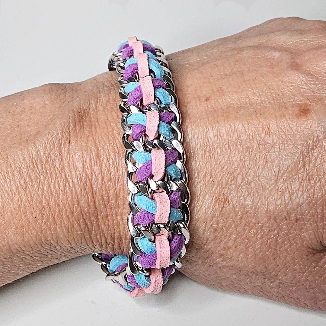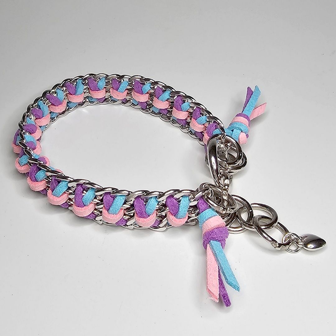 Breng magie in je sieradencollectie met de prachtige brede armband "Fairy Lagoon". Deze opvallende armband is vervaardigd uit hoogwaardig staal en drie kleuren leer: aqua, lichtroze en paars. De combinatie van het robuuste staal en de zachte, levendige kleuren van het leer maakt deze armband tot een uniek en stijlvol accessoire.