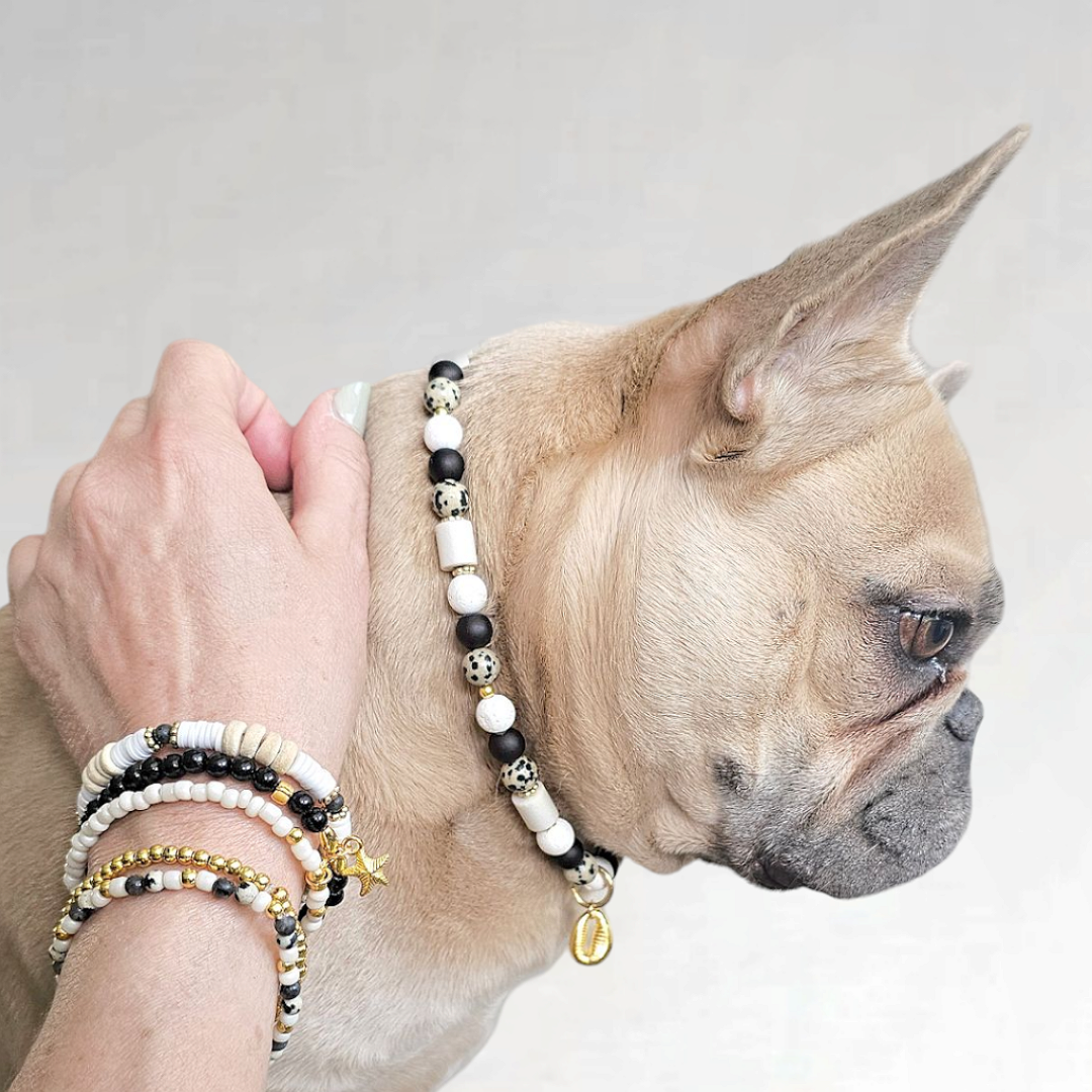 De Dalmatian armbandenset biedt veelzijdigheid en stijl, perfect voor zowel casual als formele gelegenheden. En voor je trouwe viervoeter hebben we ook een bijpassende "Dalmatian" anti-tekenketting beschikbaar, zodat jullie samen in stijl kunnen stralen.