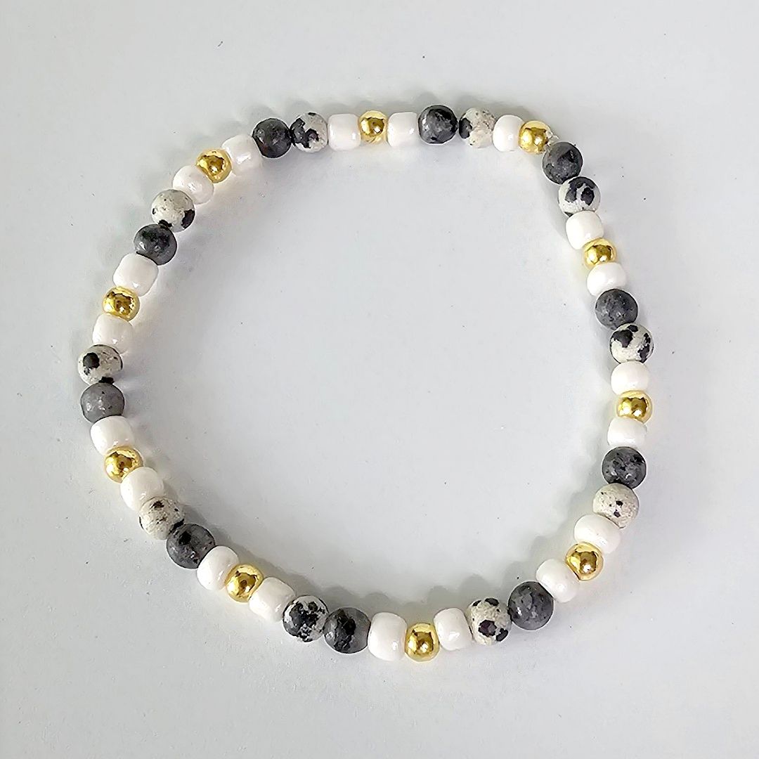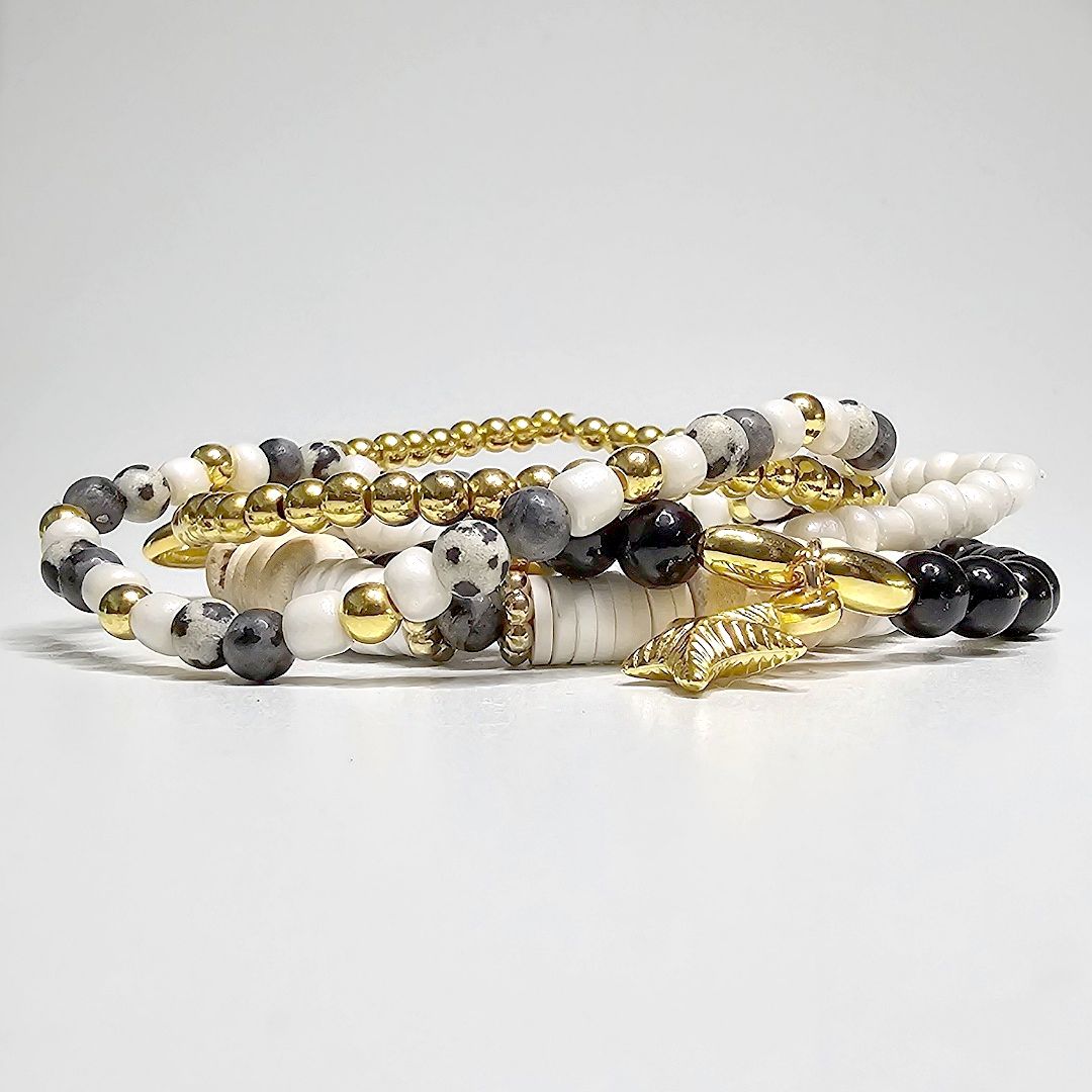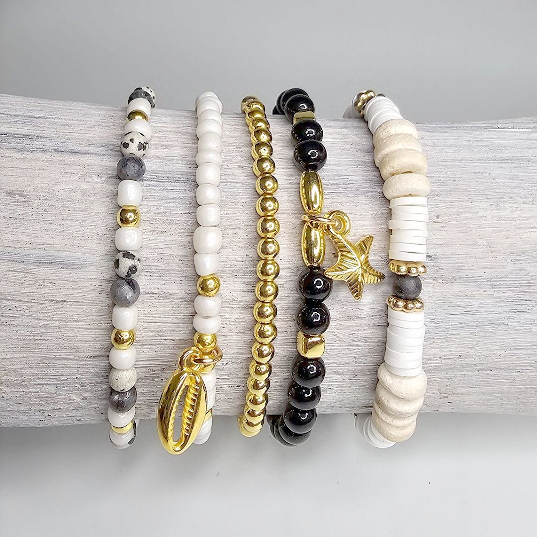 Ontdek onze opvallende armbandenset, Dalmatian, bestaande uit vijf unieke armbanden die de speelse en elegante uitstraling van de Dalmatiër weerspiegelen. De eerste armband is vervaardigd met natuursteen kralen, wat een natuurlijke en stoere touch toevoegt aan je look. De tweede armband is versierd met glinsterende gouden kraaltjes, waardoor een vleugje luxe wordt toegevoegd aan de set. De derde armband is een combinatie van ivoorkleurige kralen en een goudkleurige kaurischelp, wat een chique en exotische uitstraling geeft. De vierde armband, gemaakt van kokos, voegt een tropisch en ontspannen element toe aan de set. Tot slot, de vijfde armband, een toevoeging aan de set, is een zwarte kralen armband met een zeester bedel, wat een maritieme charme toevoegt aan de collectie.