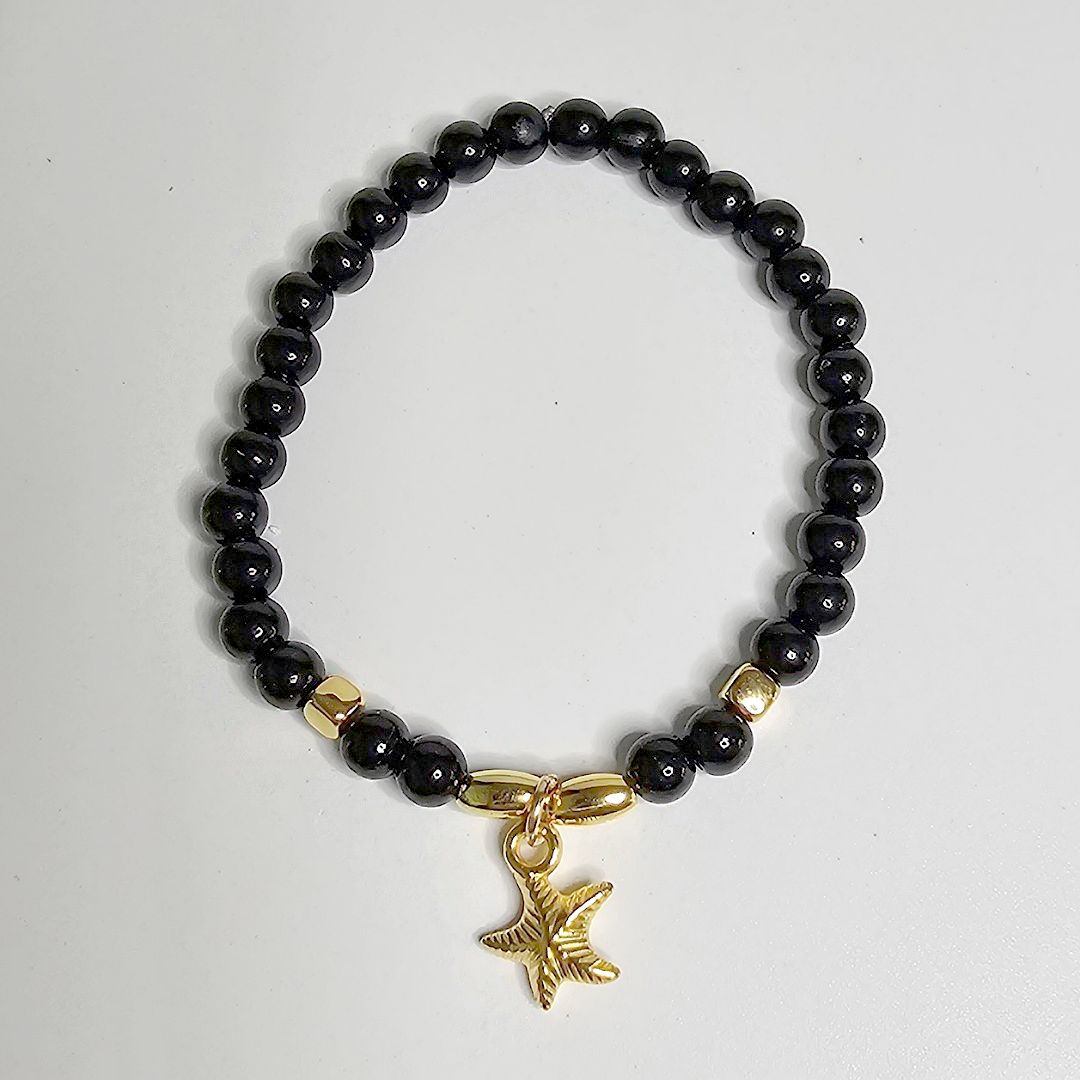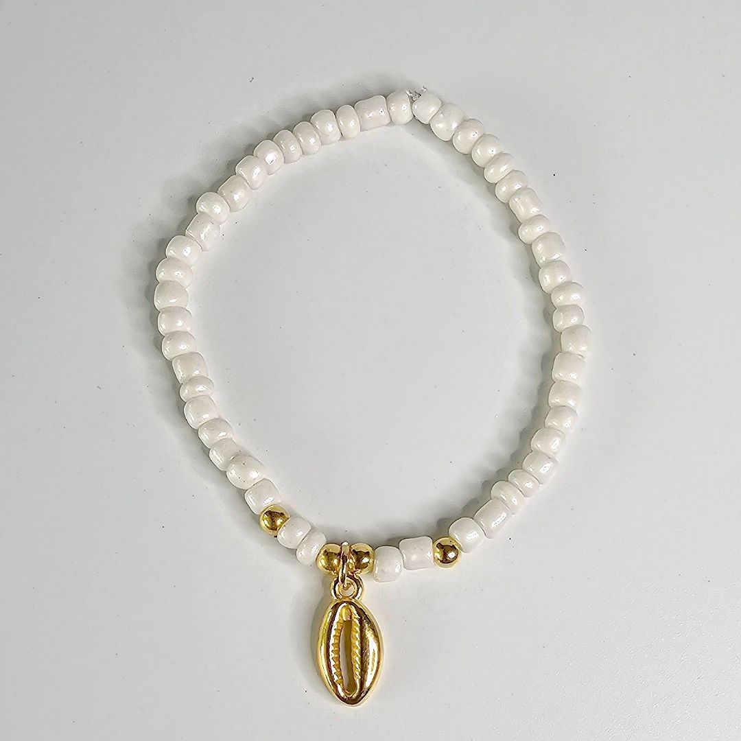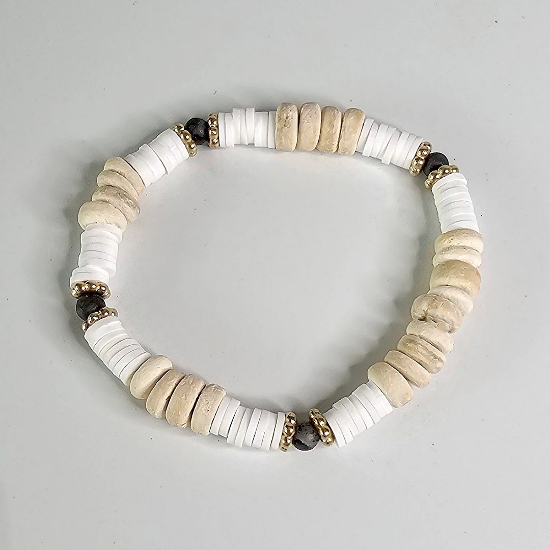 Ontdek onze opvallende armbandenset, Dalmatian, bestaande uit vijf unieke armbanden die de speelse en elegante uitstraling van de Dalmatiër weerspiegelen. De eerste armband is vervaardigd met natuursteen kralen, wat een natuurlijke en stoere touch toevoegt aan je look. De tweede armband is versierd met glinsterende gouden kraaltjes, waardoor een vleugje luxe wordt toegevoegd aan de set. De derde armband is een combinatie van ivoorkleurige kralen en een goudkleurige kaurischelp, wat een chique en exotische uitstraling geeft. De vierde armband, gemaakt van kokos, voegt een tropisch en ontspannen element toe aan de set. Tot slot, de vijfde armband, een toevoeging aan de set, is een zwarte kralen armband met een zeester bedel, wat een maritieme charme toevoegt aan de collectie.