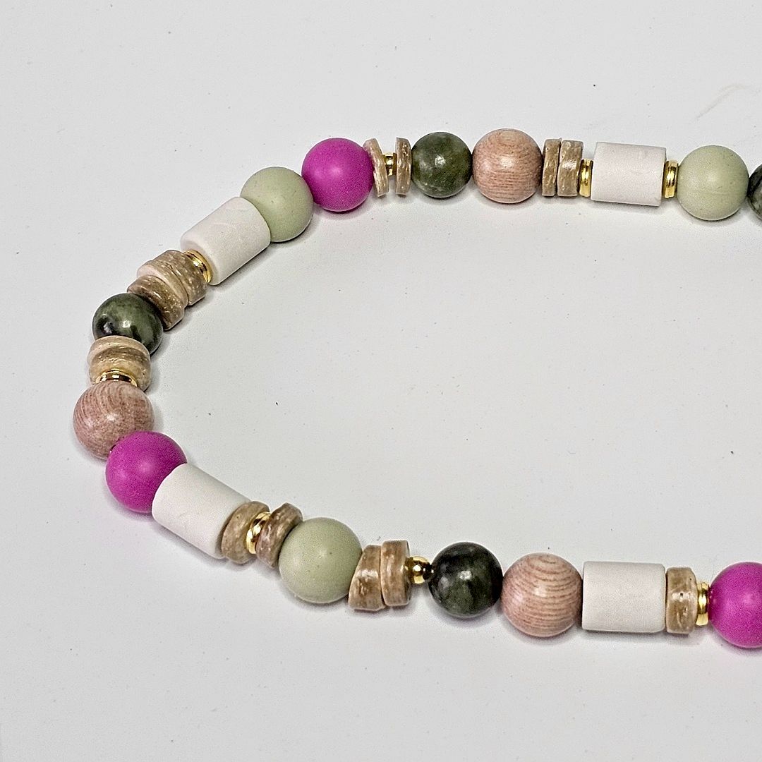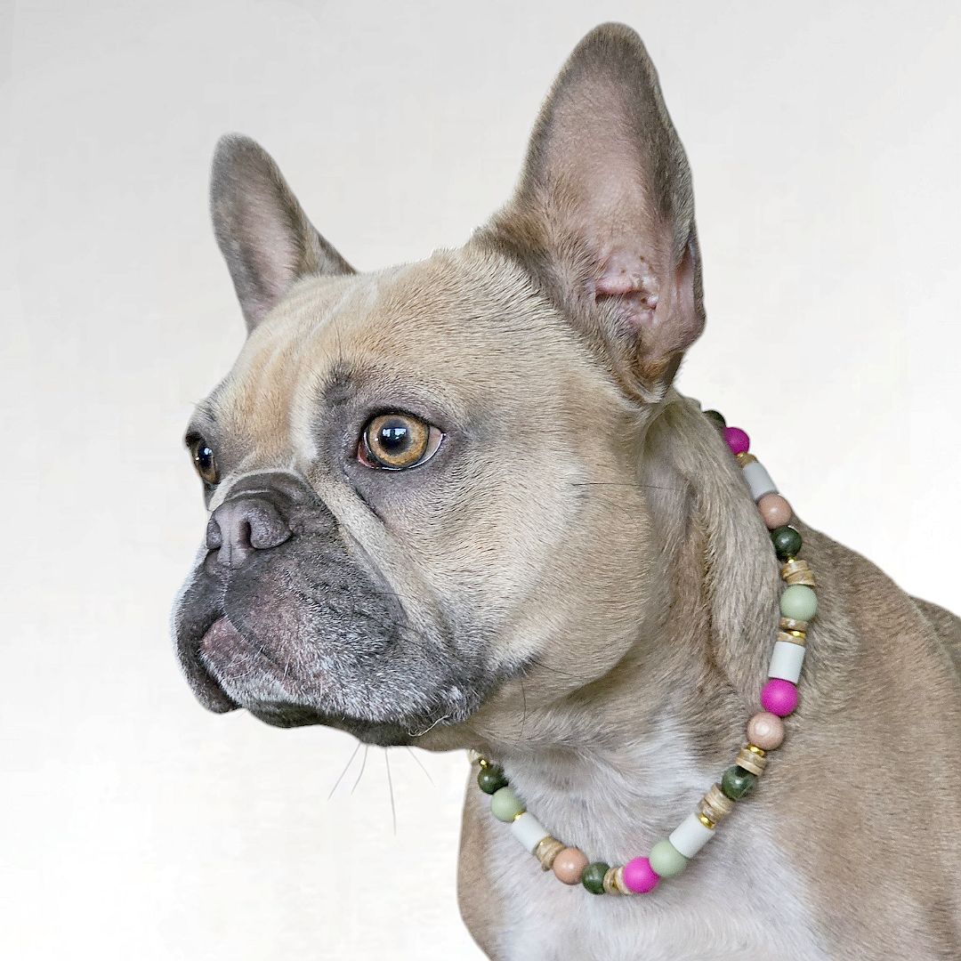 De Fuchsia Forest ketting is speciaal ontworpen voor honden die zowel avontuurlijk als stijlvol zijn. Deze unieke ketting, met levendige groentinten, fuchsiakleuren en natuurlijke kokoskralen, straalt een speelse maar verfijnde uitstraling uit. De zilveren of gouden details geven een vleugje luxe, terwijl het sterke microcord, met een breekkracht van 80 kg, zorgt voor maximale veiligheid en duurzaamheid.