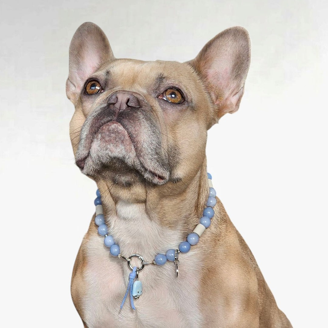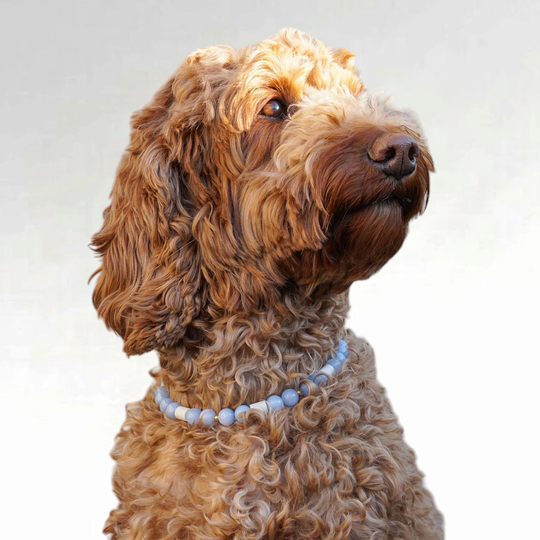De Aquamarine Breeze is een handgemaakte anti-tekenketting met aquamarijn, een natuursteen die bekendstaat om zijn kalmerende eigenschappen. Deze steen helpt honden ontspannen, vermindert stress en bevordert een gevoel van innerlijke rust. Ideaal voor honden die gevoelig zijn voor prikkels of snel nerveus worden.