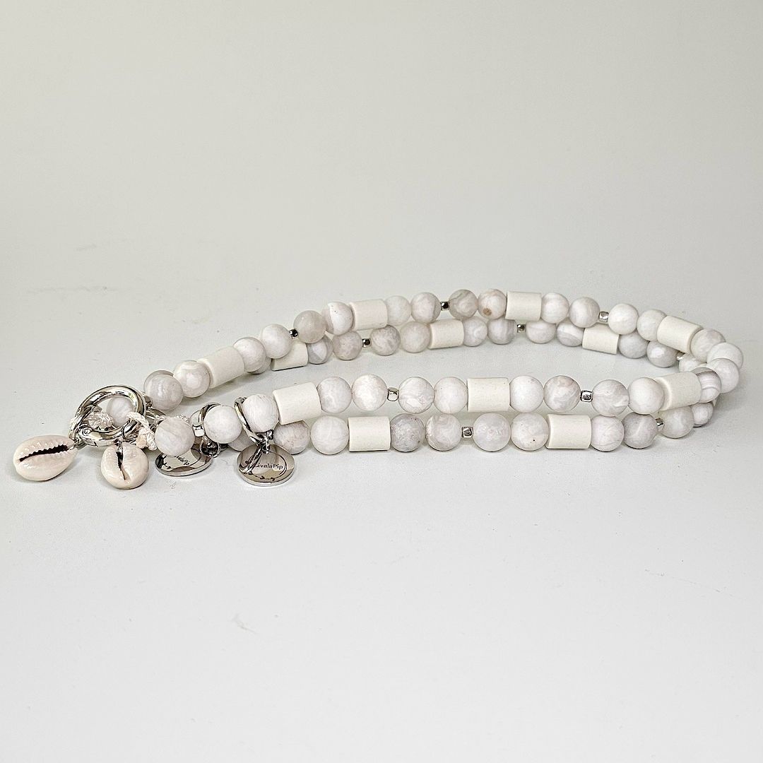 Stap samen met je trouwe viervoeter in de betoverende wereld van bohemian stijl en natuurlijke bescherming! Ontdek onze prachtige Bohemian ketting, gemaakt van prachtige matte witte maansteen kralen. Kies uit onze collectie met of zonder anti-tekenkralen, zodat jouw harige vriend er niet alleen stijlvol uitziet, maar ook optimaal beschermd is tijdens jullie avonturen in de natuur. Laat de rustgevende energie van de witte maansteen jullie avonturen verlichten terwijl jullie genieten van zonnige dagen onder rieten parasols en op het zachte zand. Bescherm je geliefde metgezel op een natuurlijke en prachtige manier, en laat de bohemian spirit stralen!