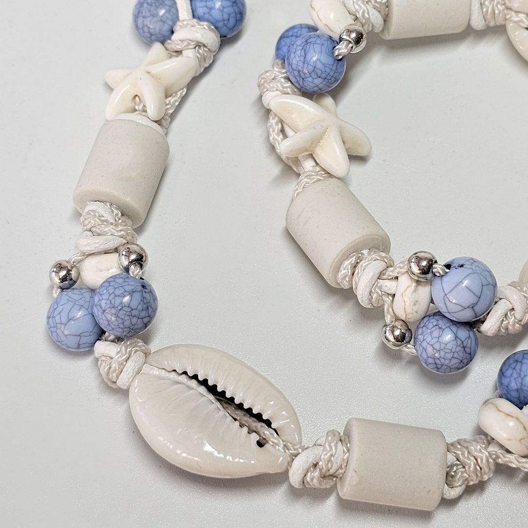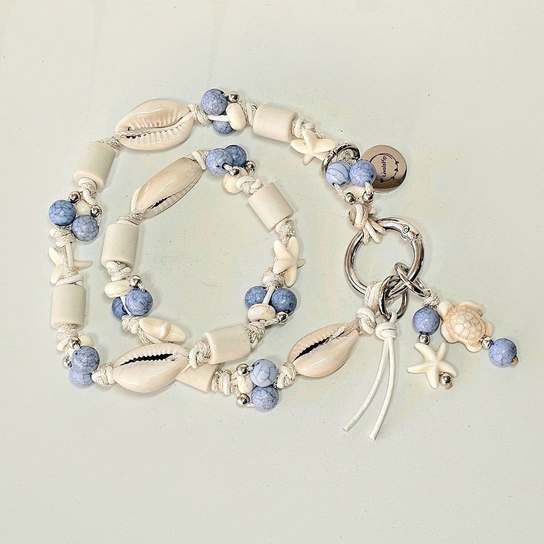 Zon, zee en frisse lucht—de Shellwave anti-tekenketting  is geïnspireerd op het strand en gemaakt voor honden die graag buiten zijn. Met de hand geknoopt op wit leer en versterkt met sterk koord, zodat de ketting comfortabel zit én stevig is. Afgewerkt met keramieken kralen, schelpen, zeesterren en een kleine schildpad in zachte, natuurlijke tinten.