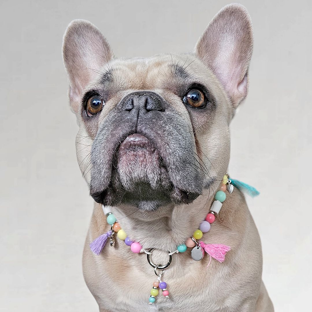 Laat je harige metgezel vrij rondrennen en geniet samen van de zomerse dagen terwijl de kleurrijke flosjes en schattige bedeltjes aan de ketting een vrolijke en zorgeloze sfeer creëren.