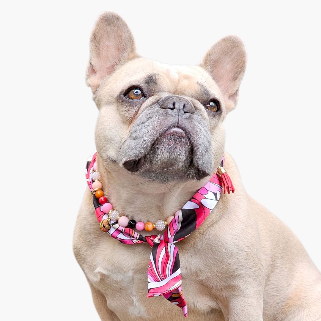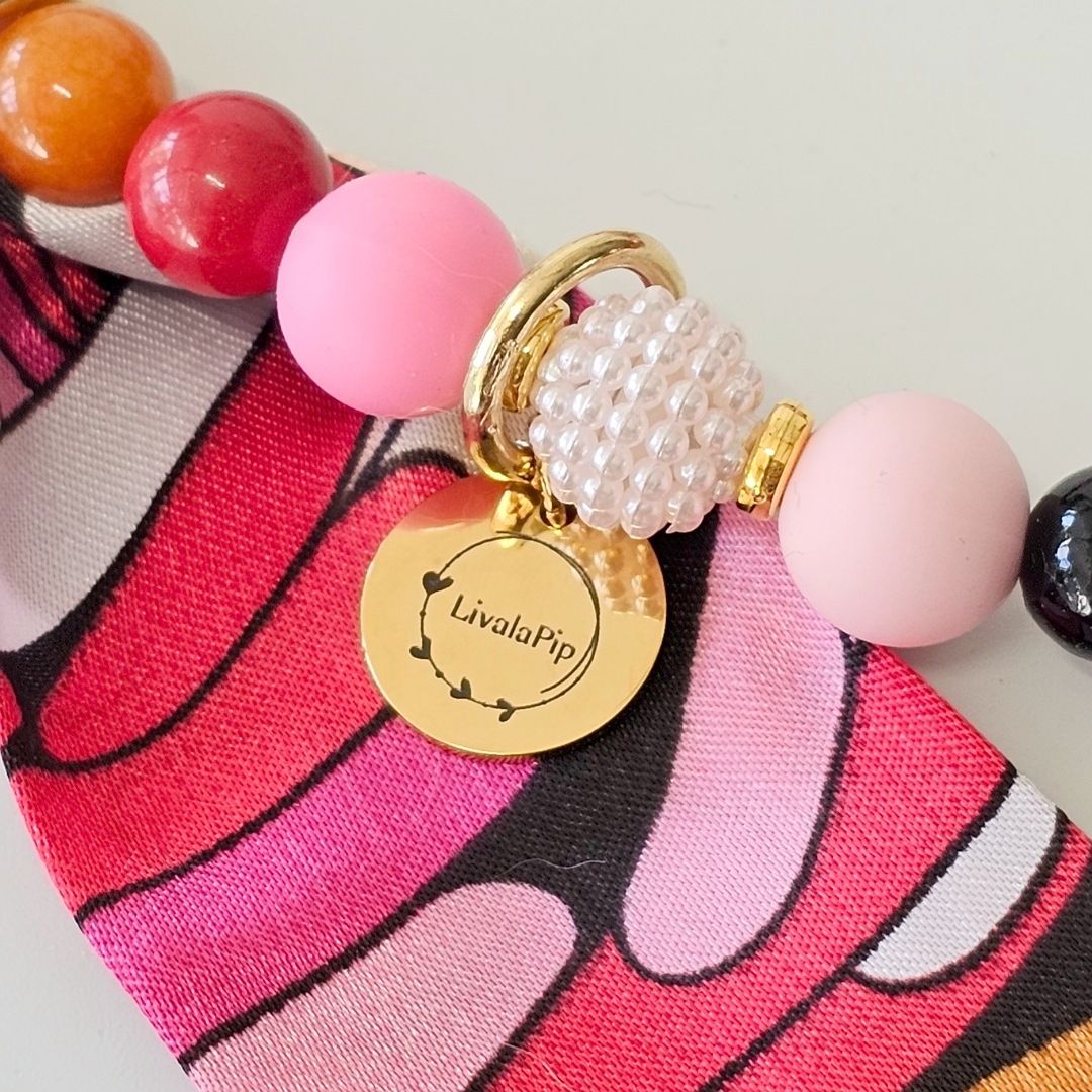 Laat je hond stralen met de LivalaPip Original© Gypsy Pink Bandana Ketting! Dit unieke, handgemaakte hondenaccessoire is een kleurrijke combinatie van een trendy sjaal en een speelse kralenketting in één. Het is een waar fashion statement en de ultieme blikvanger voor je viervoeter.