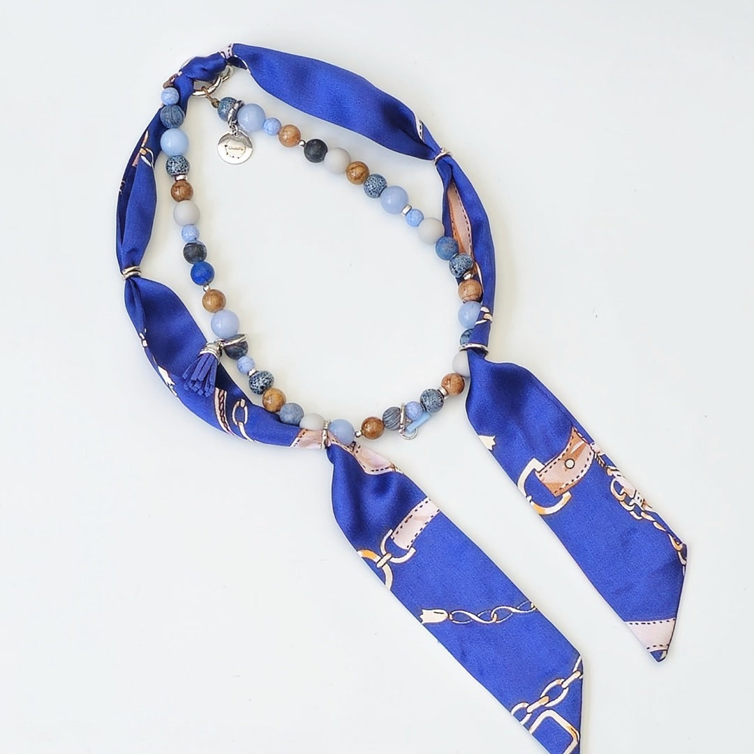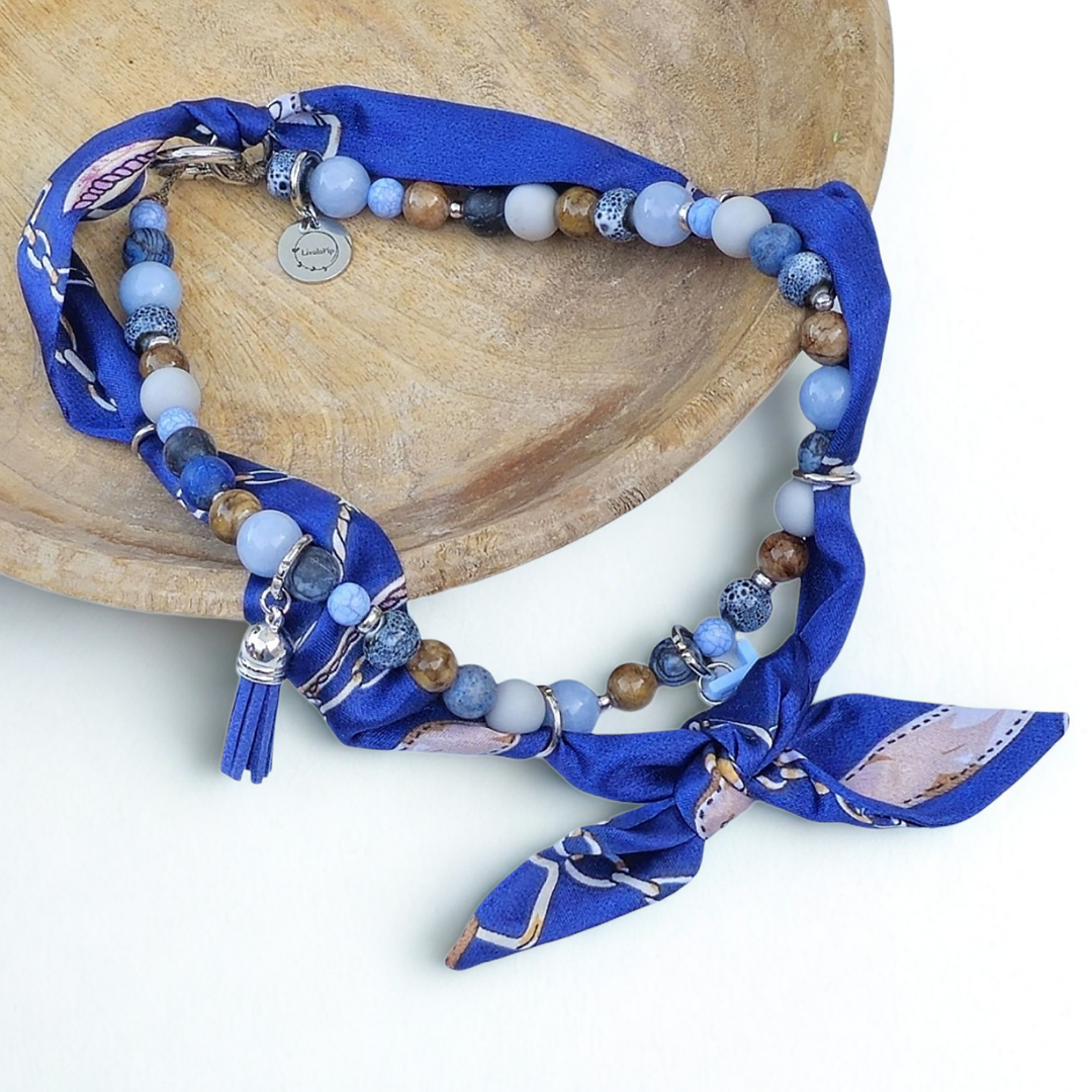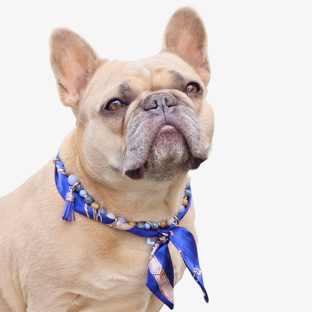 Geef je hond een unieke look met de "Copper Sky" bandana ketting. Deze LivalaPip Original is handgemaakt met een prachtige mix van kralen, waaronder natuursteen en keramiek in verschillende blauwtinten. Elke kraal is zorgvuldig uitgekozen en samen vormen ze een speels maar stijlvol geheel.