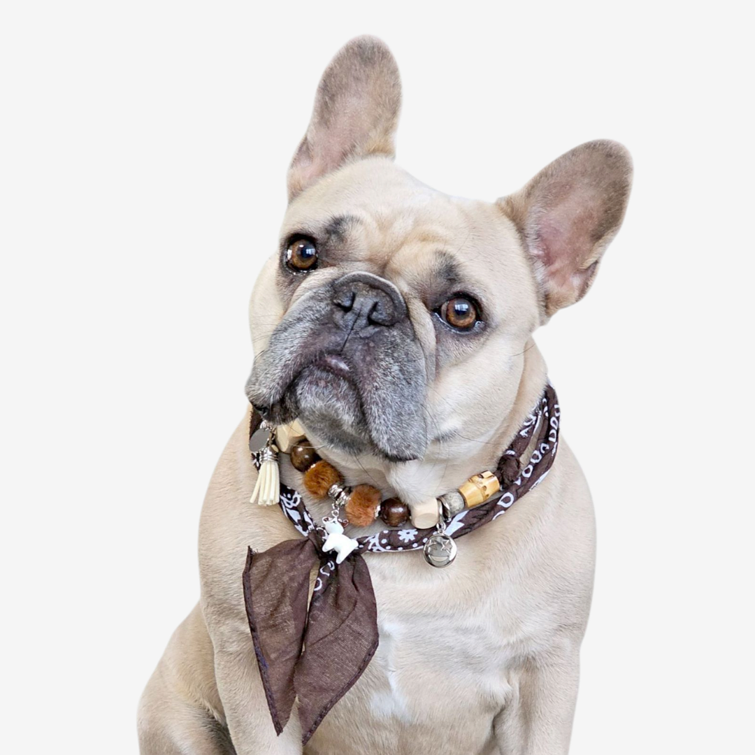 De Ibiza Brown is een bandana ketting voor honden, boordevol boho vibes en een snufje strandgevoel. Handgemaakt met kralen, en lieve bedels, is elke ketting uniek, vrolijk en helemaal in LivalaPip-stijl.