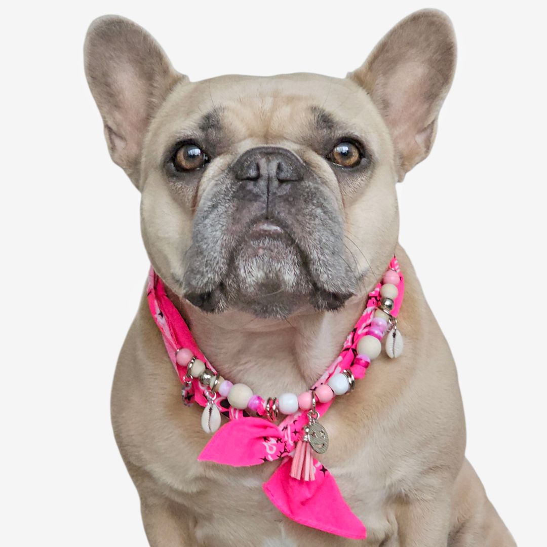 De Ibiza Neon Pink is een zomerse bandana ketting voor honden, boordevol boho vibes en een snufje strandgevoel. Handgemaakt met kralen, schelpen en lieve bedels, is elke ketting uniek, vrolijk en helemaal in LivalaPip-stijl.