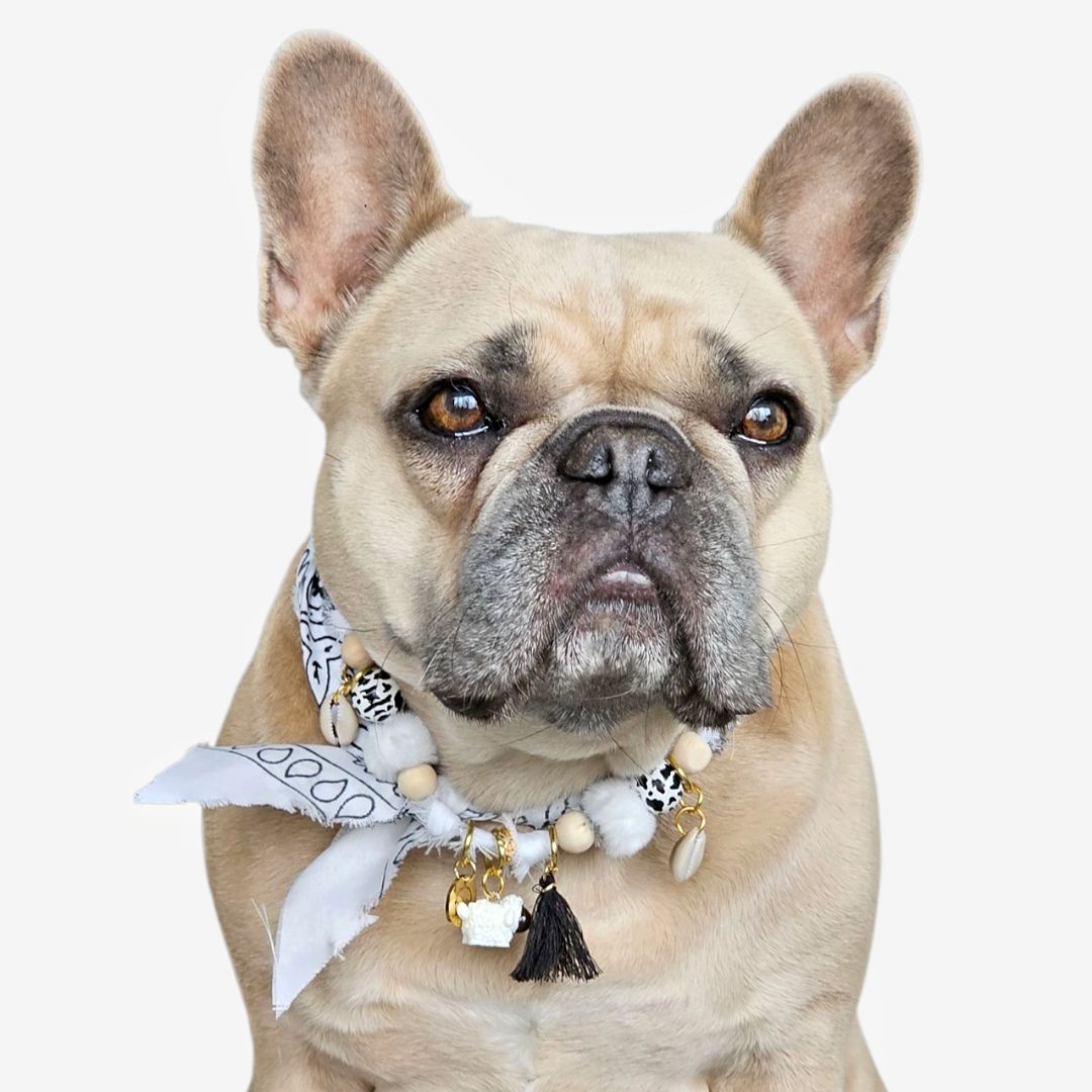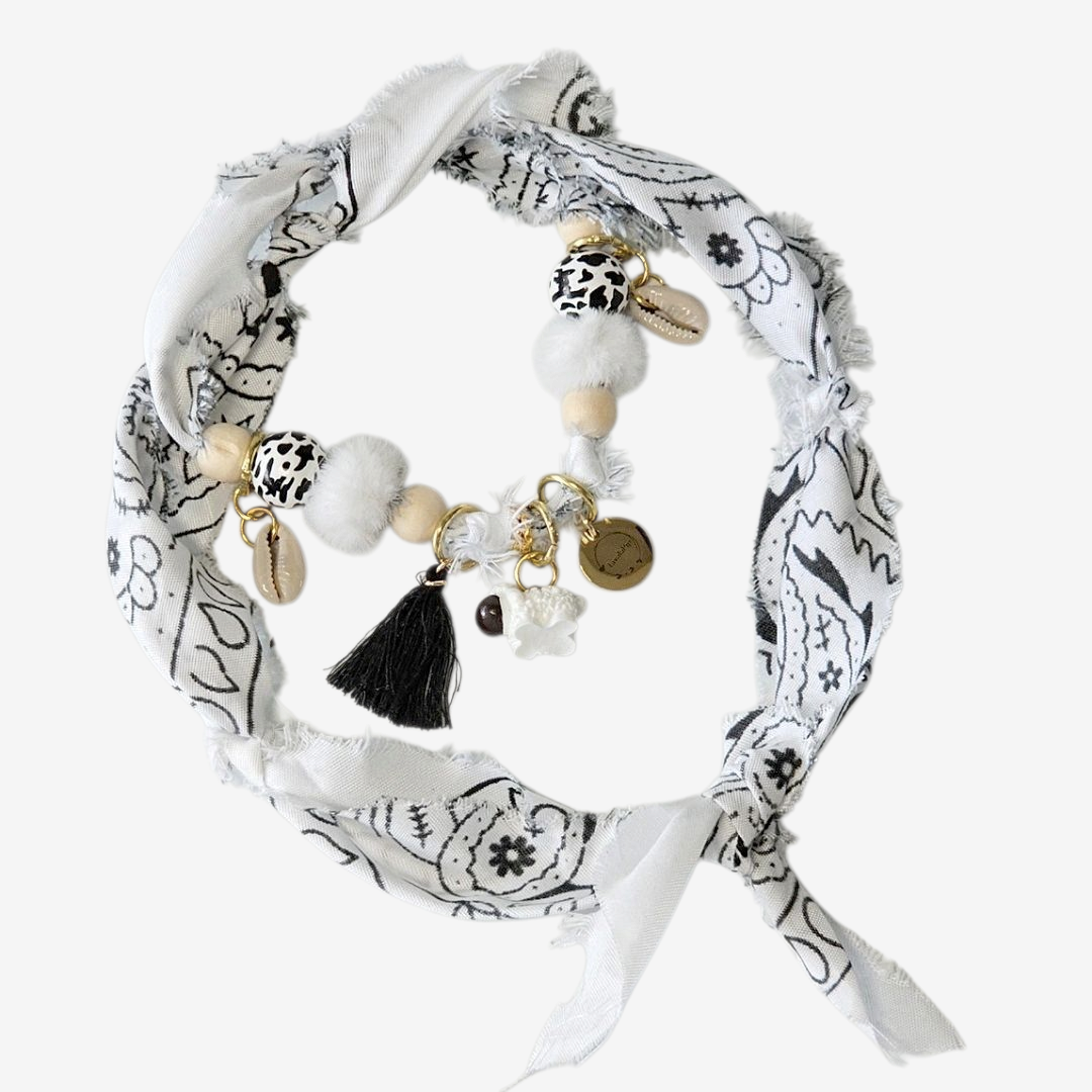 De Ibiza White is een zomerse bandana ketting voor honden, boordevol boho vibes en een snufje strandgevoel. Handgemaakt met kralen, schelpen en lieve bedels, is elke ketting uniek, vrolijk en helemaal in LivalaPip-stijl.