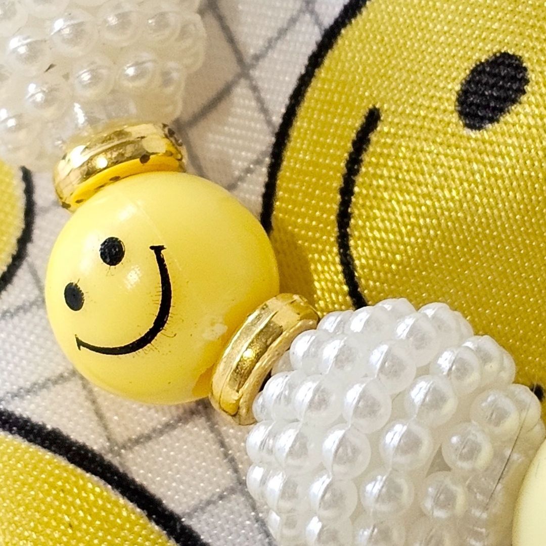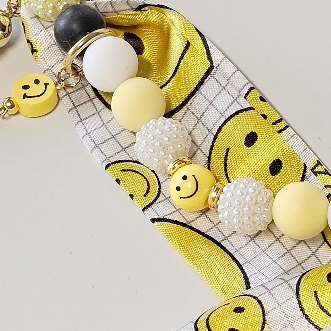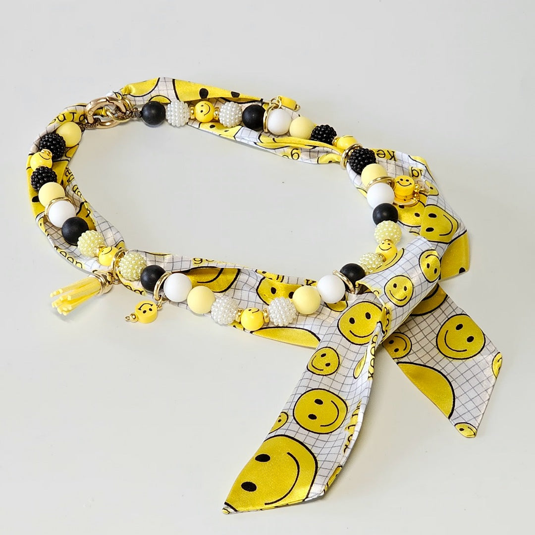 De ketting heeft een basis van een zachte, gele bandana met overal vrolijke smiley’s. De kralen zijn zorgvuldig geselecteerd in helder geel, chic zwart en klassiek wit, wat zorgt voor een stijlvol contrast. De ketting is afgewerkt met gouden of zilveren details en unieke kralen met een speelse pareltextuur en natuurlijk de schattige smileykralen die de ketting een extra vrolijke touch geven.