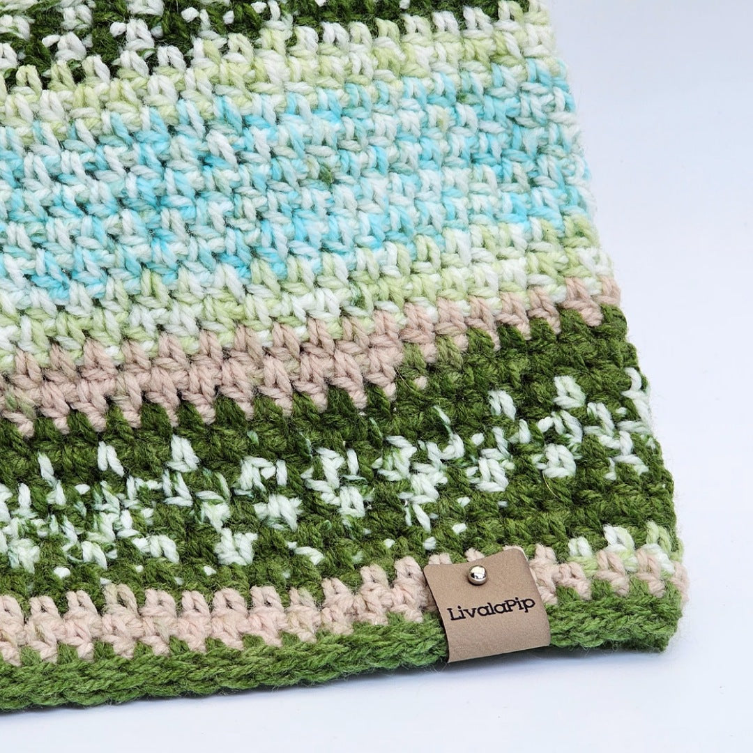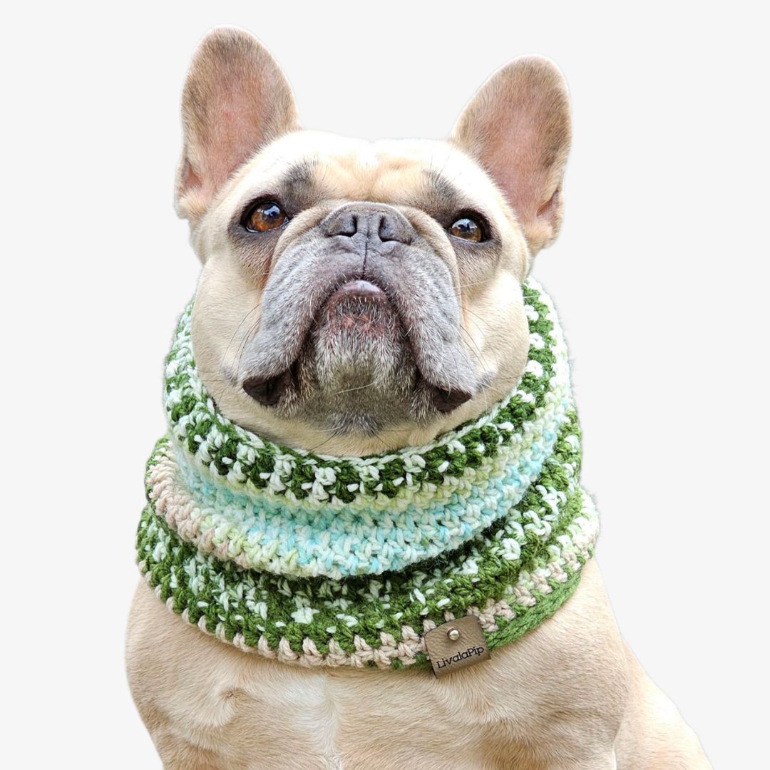 De harmonieuze tinten van deze handgemaakte honden sjaal zijn geïnspireerd op een boswandeling in de lente of vroege herfst: frisgroen, zachtblauw, sereen beige en romig wit. Deze kleurencombinatie geeft je hond een natuurlijke en charmante uitstraling, perfect voor avonturen in de buitenlucht. Deze honden sjaal is niet alleen een lust voor het oog, maar houdt je hond ook behaaglijk warm tijdens elk buitenavontuur.