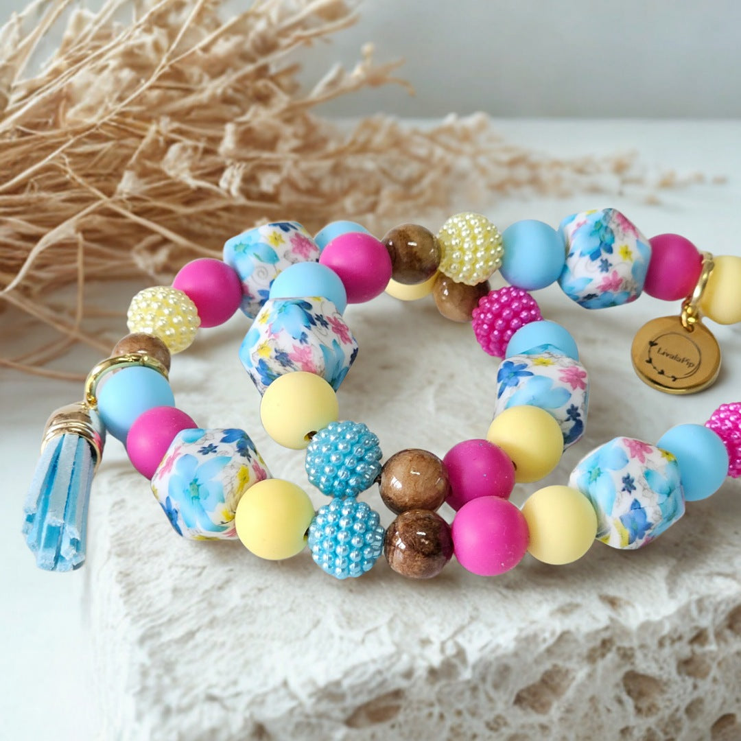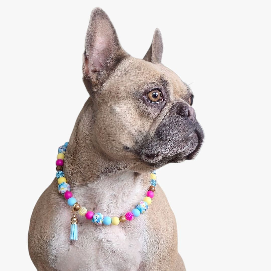 De Bloomy Vibes hondenketting brengt vrolijkheid en kleur in de look van jouw hond. Deze handgemaakte ketting is samengesteld uit een speelse mix van kralen in levendige tinten: felroze, zonnig geel, turquoise blauw en warme houten accenten. De kralen met bloemenprint zorgen voor een frisse en speelse uitstraling, terwijl het blauwe suede kwastje het ontwerp stijlvol afrondt.