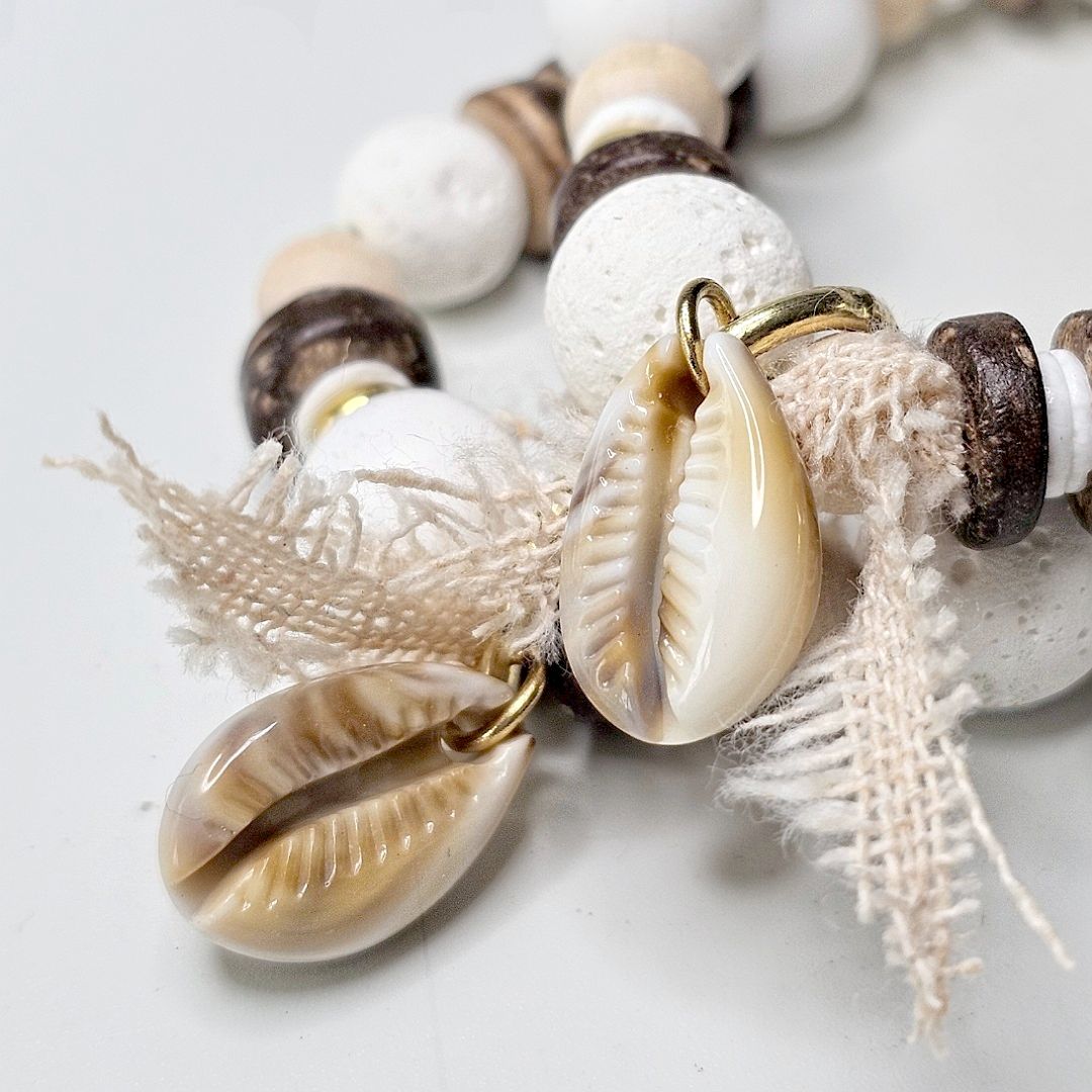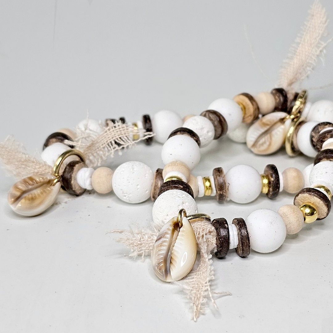Geef je trouwe viervoeter een vleugje bohemian stijl met de Boho Sands ketting. Deze prachtige ketting combineert natuurlijke materialen zoals kokoskralen, lavakralen en linnen rafels met elegante witte schelpkralen en schelpbedels. Het resultaat is een uniek accessoire dat zowel robuust als comfortabel is voor je hond.De Boho Sands Hondenketting is geïnspireerd door de rustieke charme van de natuur en de kalme schoonheid van de kust. Met zijn rustieke en natuurlijke uitstraling past deze ketting perfect bij honden die graag een unieke en modieuze uitstraling hebben. Of je nu een wandeling maakt op het strand, in het park of door de stad, deze ketting zorgt ervoor dat je hond er altijd stijlvol uitziet.