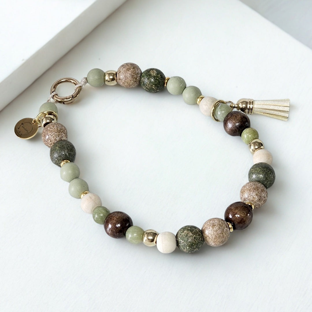Een rustgevende mix van mosgroen, zandsteen, houtbruin en zachte crèmetinten - de "Forest Drift" halsketting brengt je hond helemaal in balans met de natuur. De kralen zijn deels handgemaakt en stevig afgewerkt, met een toefje natuursteenkralen voor die pure, aardse look.
