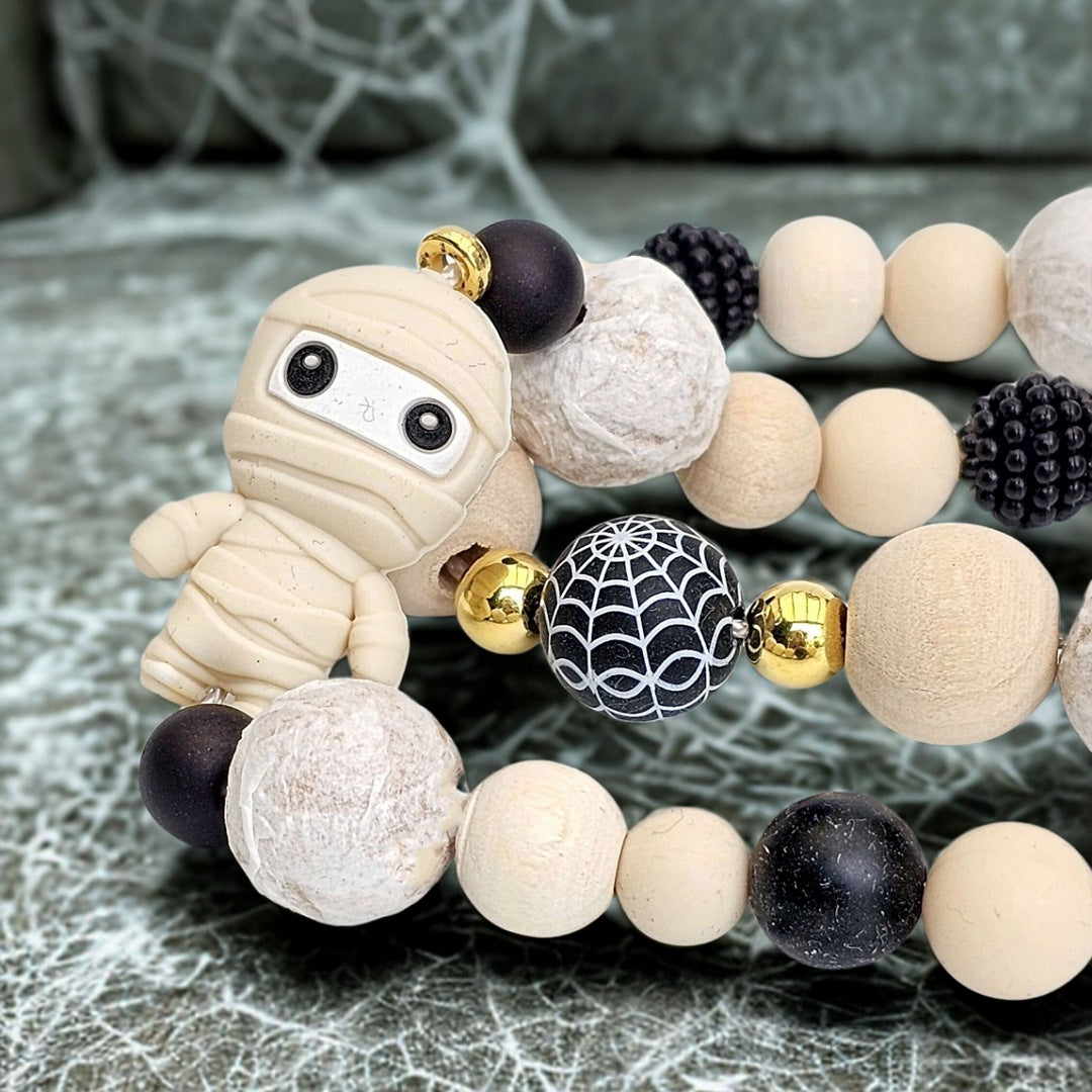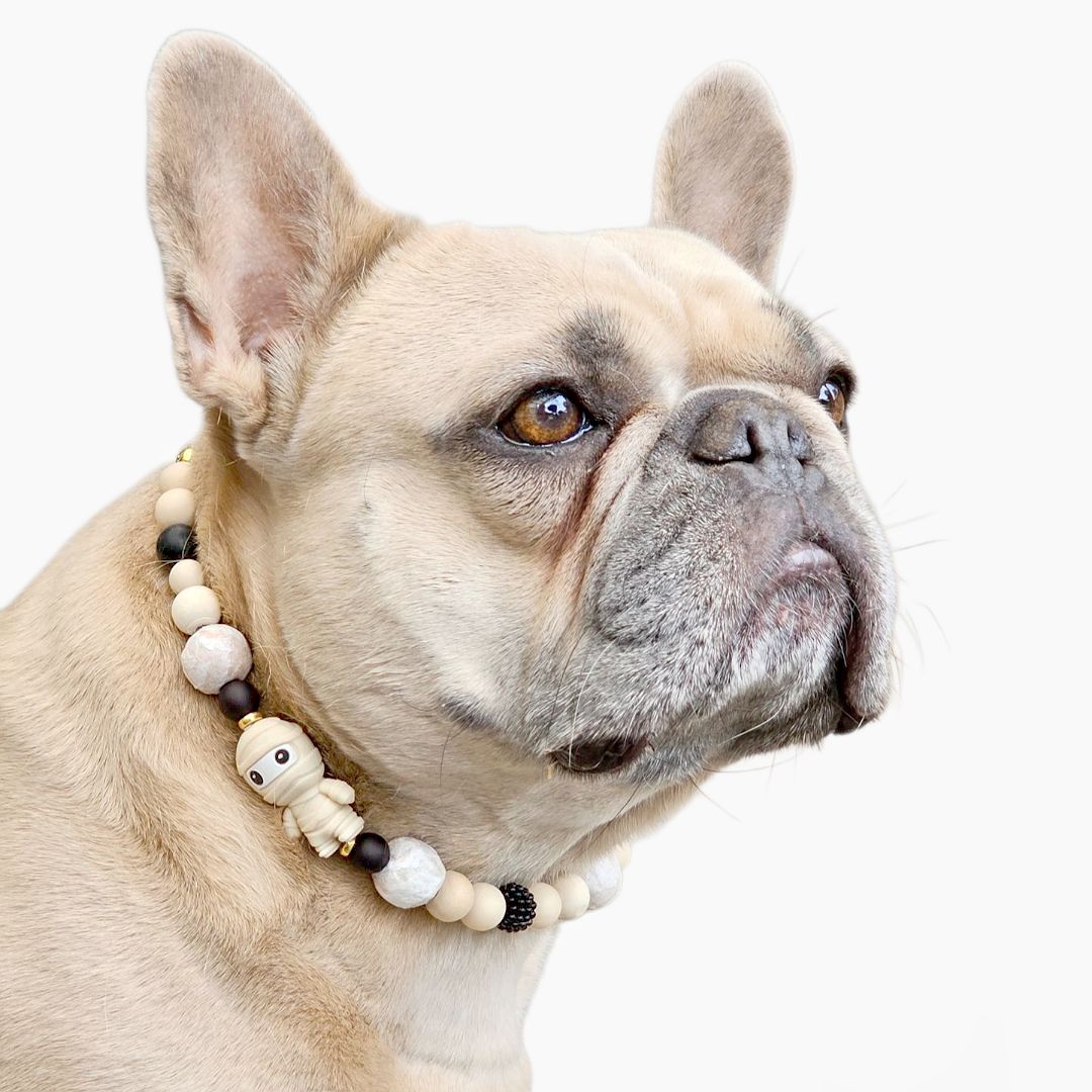 De handgemaakte ketting is een echte blikvanger. Het hoogtepunt is een vrolijk mummiefiguurtje, omringd door kralen in natuurlijke tinten, zwart en zelfs een griezelig cool spinnenwebdesign. Deze mix van kleuren - van zachte crèmekleuren tot diepzwart en sprankelend goud - geeft de ketting een chique, maar toch speels en spooky karakter. Gemaakt van zorgvuldig geselecteerde materialen, waaronder handgemaakte mummiekralen, is deze ketting comfortabel en veilig voor je hond om te dragen.