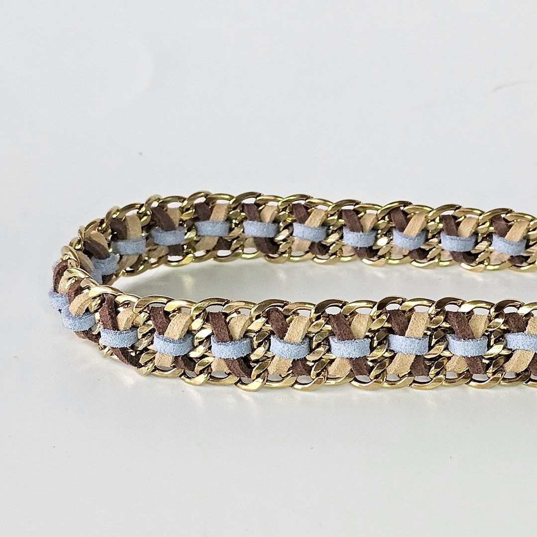 De "Caramel Sky" ketting/ collar is een stijlvolle en comfortabele accessoire voor je hond. Deze unieke ketting combineert het stoere van roestvrij staal (RVS) met de zachtheid van geknoopt leer, in een prachtige kleurencombinatie van donkerbruin, caramel bruin en blauw.