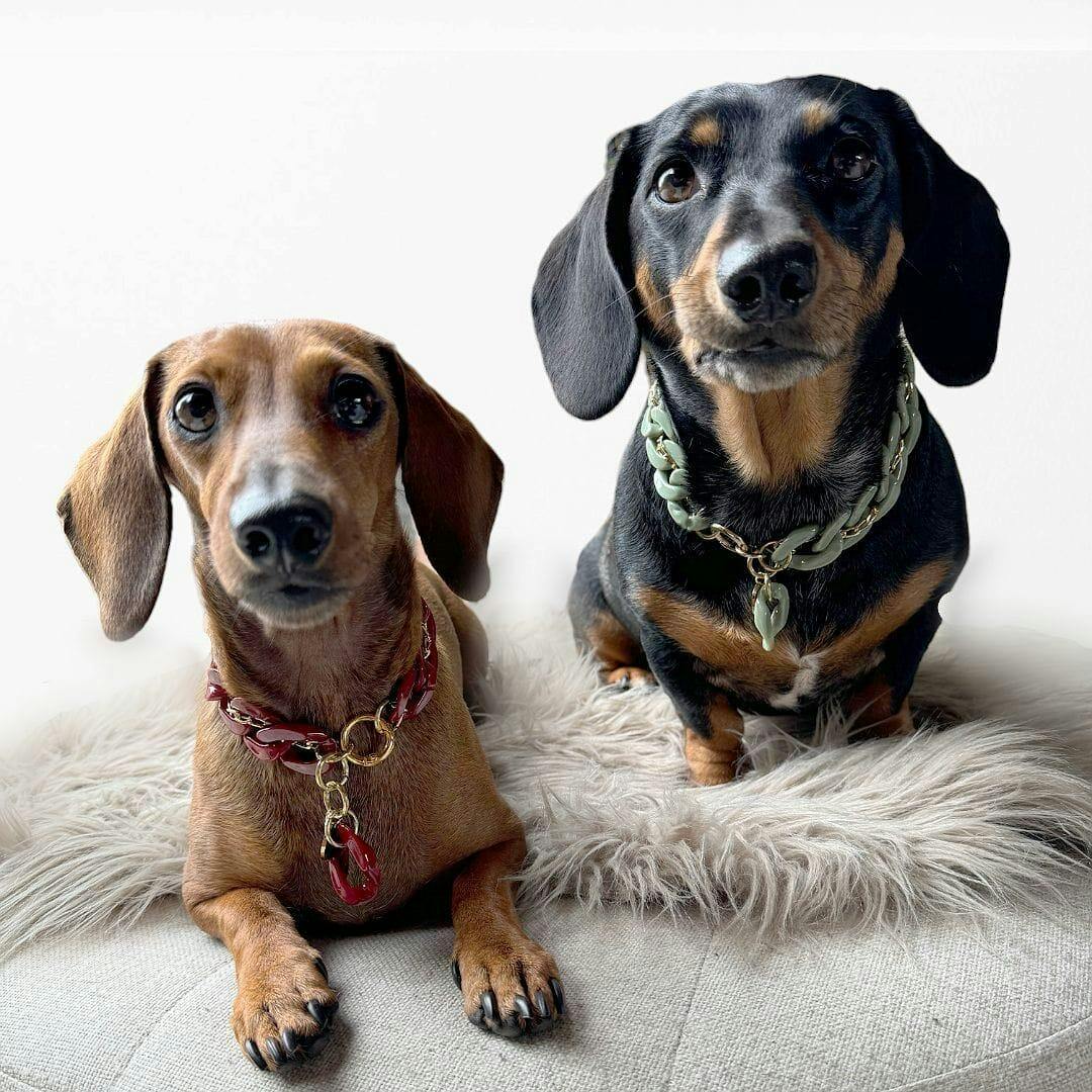 Ontdek onze elegante "Merlot Red" acryl schakelketting, speciaal ontworpen voor honden met een flair voor stijl. Deze ketting, uitgevoerd in een rijke, diepe wijnrode kleur, combineert moeiteloos comfort met mode. Met een breedte van 2,5 cm en een afwerking in zilver- of goudkleur is deze ketting de perfecte keuze voor eigenaren die hun viervoeter een verfijnde look willen geven.