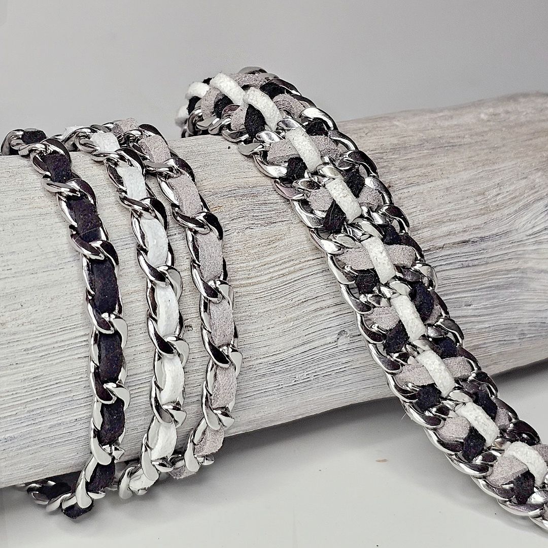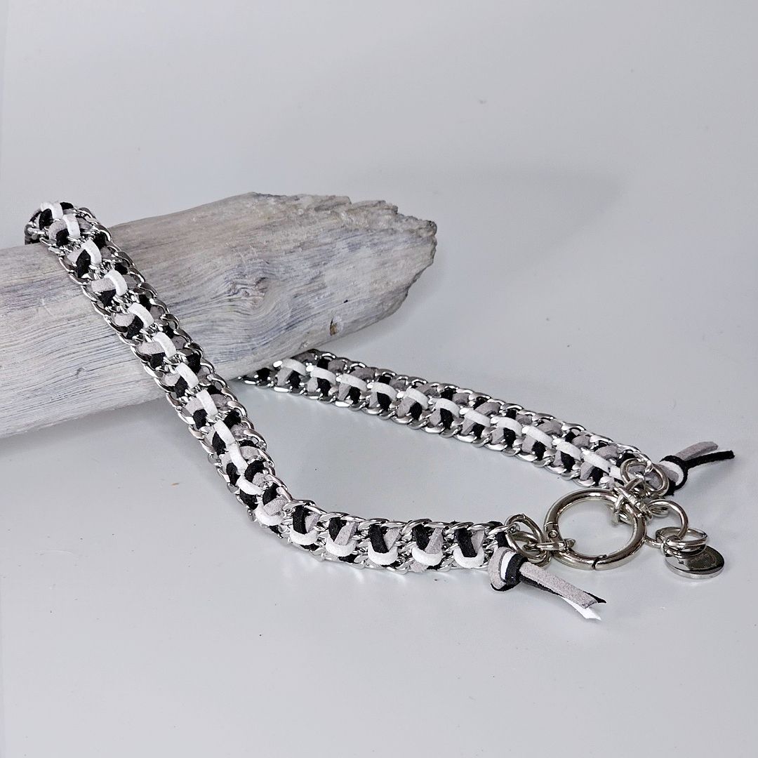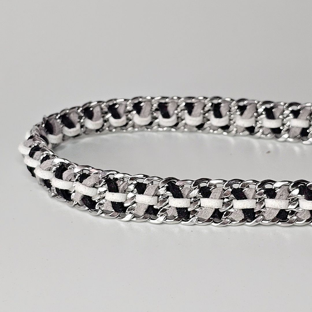 De "Black Shadow" ketting/ collar is een stijlvolle en comfortabele accessoire voor je hond. Deze unieke ketting combineert het stoere van roestvrij staal (RVS) met de zachtheid van geknoopt leer, in een prachtige kleurencombinatie van zwart, wit en grijs.