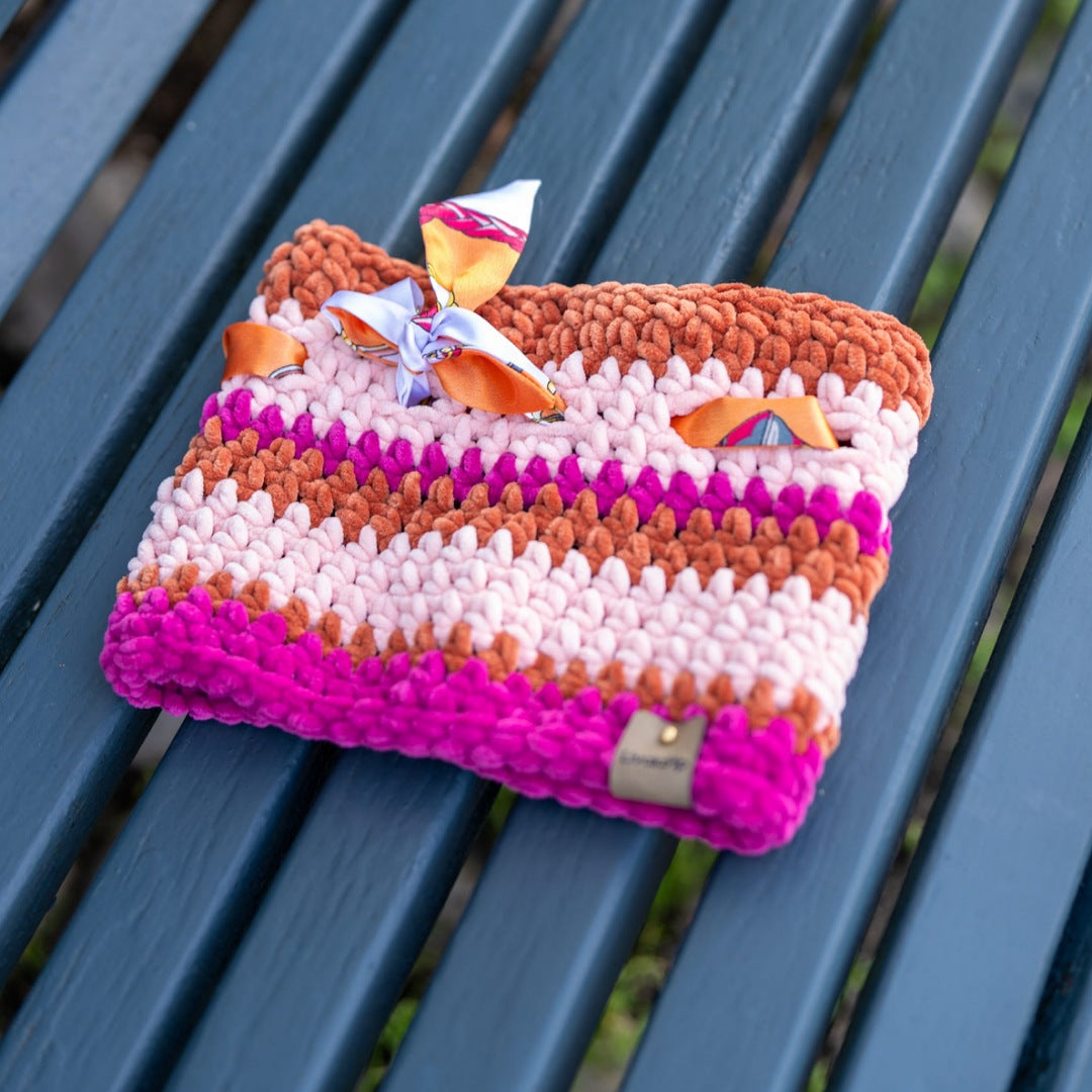 De warme tinten, het zachte breisel en het kleine zijden sjaaltje geven instant café terrace vibes — denk croissantjes, zonnestralen en een vleugje parfum in de lucht.